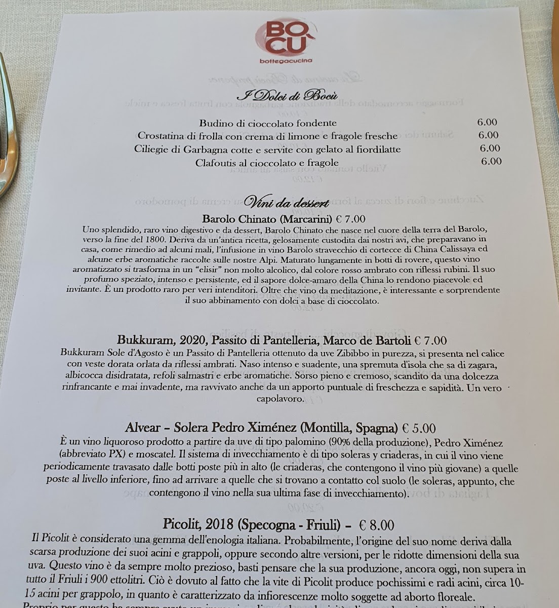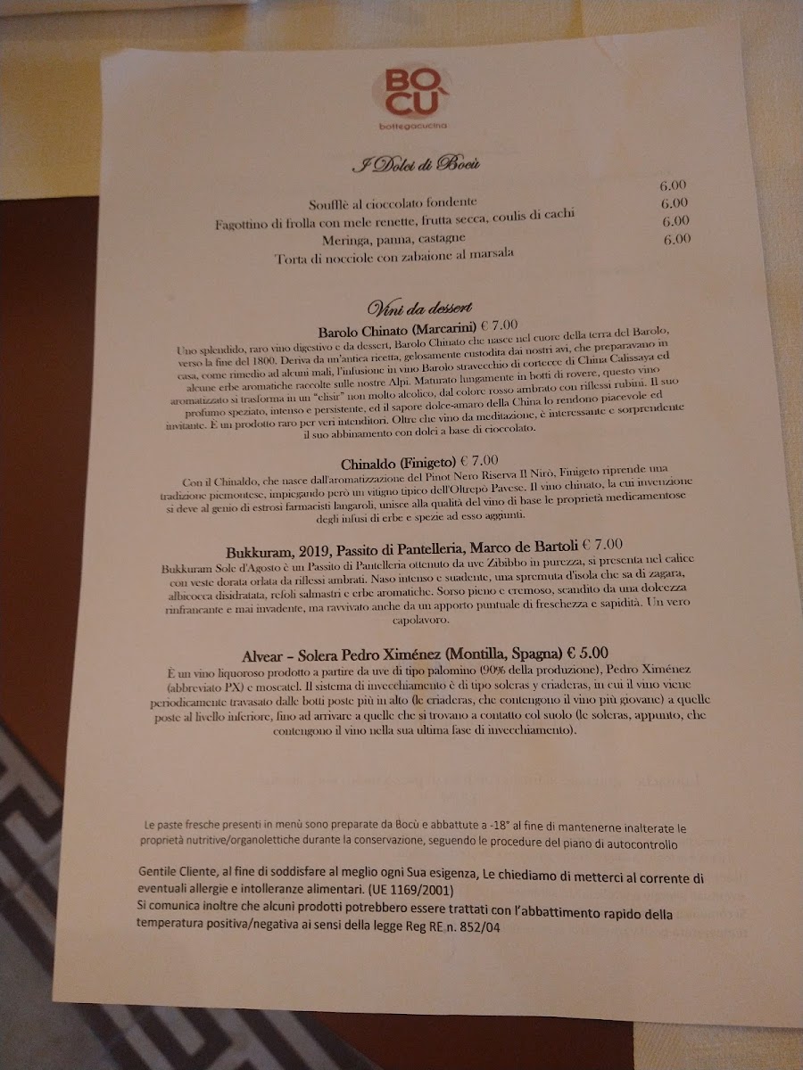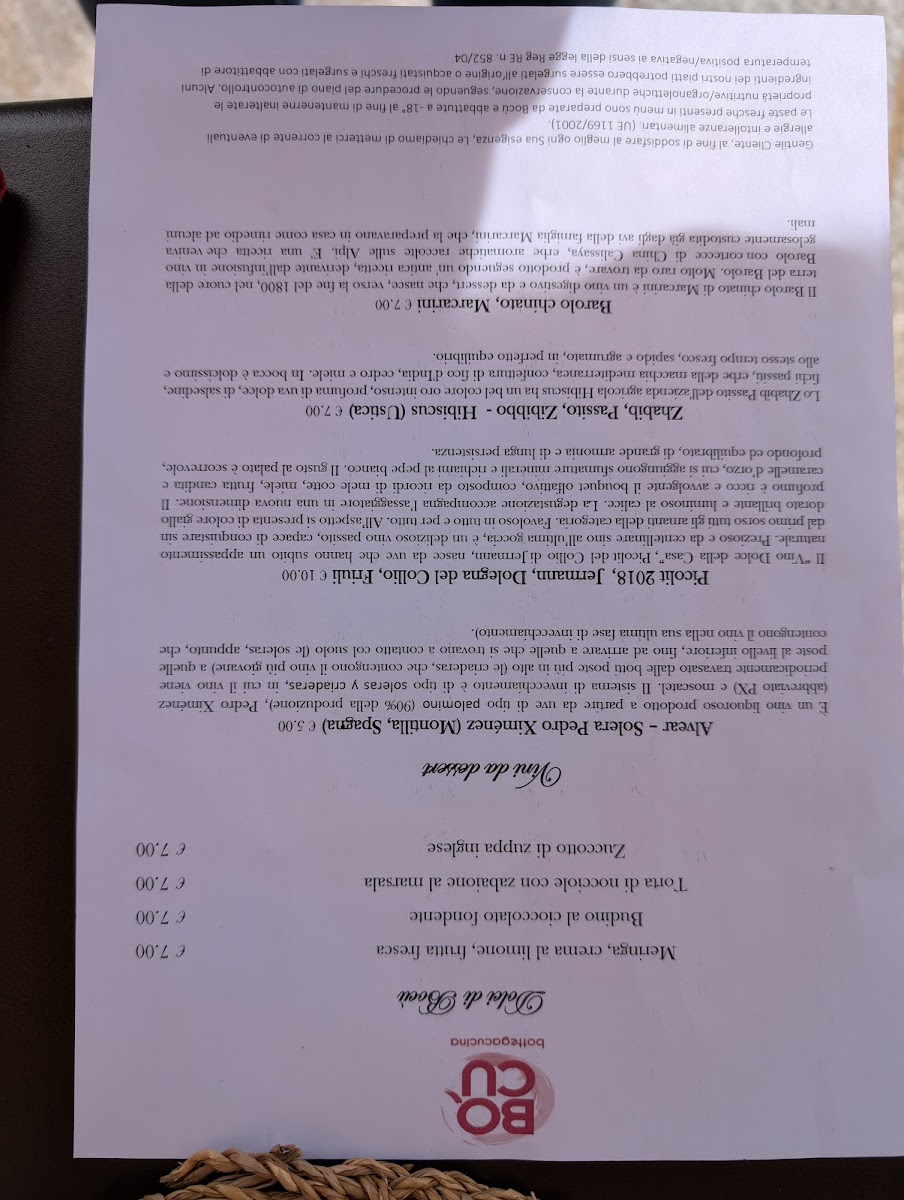 The wine list completes the experience without overshadowing the food. Local and regional selections such as Barbera, Parcellari Nebbiolo, and the ever-approachable Prosecco are well chosen to match the menu’s rhythm, supporting both delicate starters and robust mains. Taken together, the menu reflects a clear culinary vision-rooted in tradition, guided by seasonal sensibility, and executed with consistency-making each course feel like part of a coherent, well-paced dining experience rather than a collection of standalone dishes.